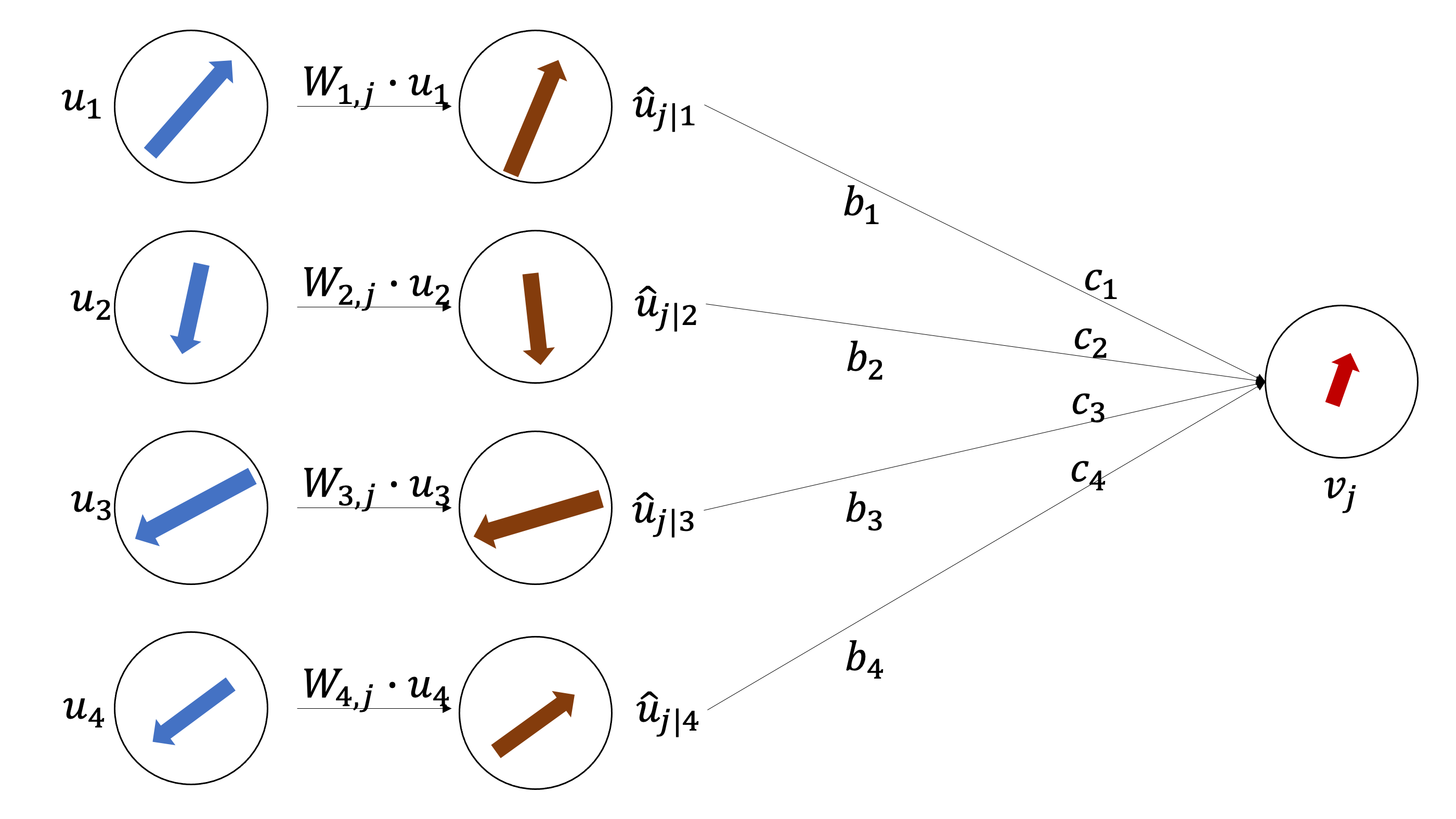 - $\hat{\mathbf{u}}_{j \mid i}=\mathbf{W}_{i j} \mathbf{u}_i$
