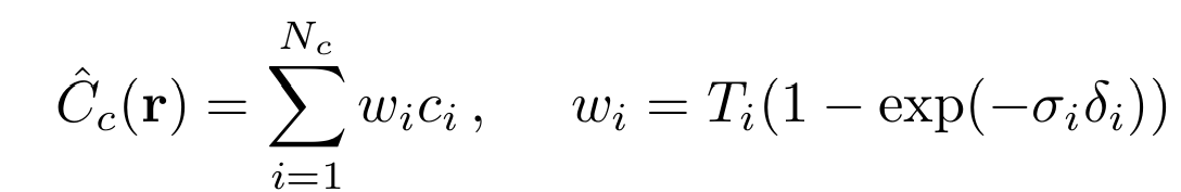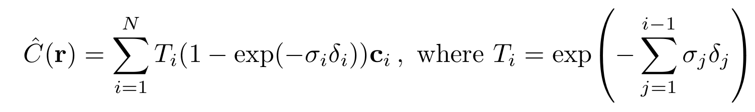 - Classical volume rendering 기법을 사용하여 한 ray에 위치하는 sample 포인트들의 색과 밀도를 2d 이미지로 합쳐줌
