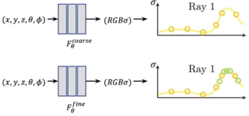 camera ray의 query point를 sampling 할 때 물체가 존재하지 않거나 뒤쪽에 있어 랜더링에 영향을 미치지 않는 포인트들은 샘플링 하는 의미가 없음. -> 더 효과적인 샘플링 전략 필요