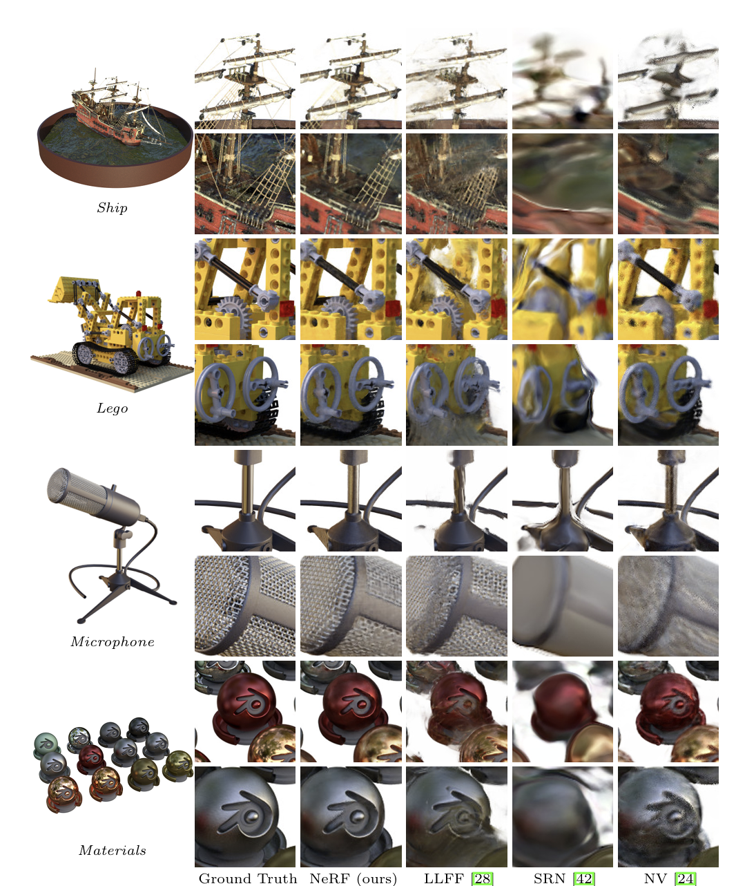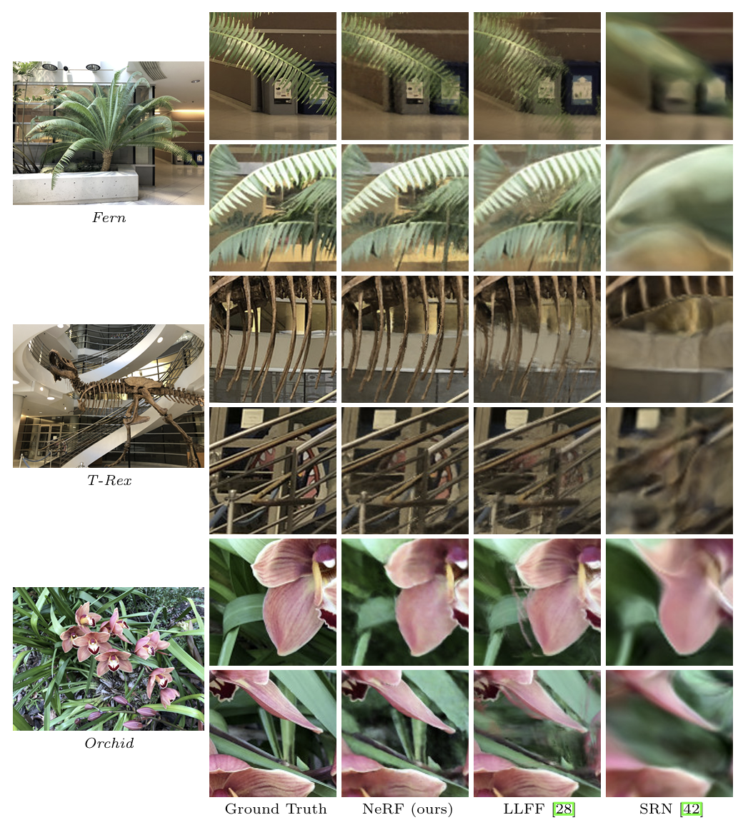 - NeRF가 대부분의 평가 지표에서 기존 방법보다 우수한 성능을 보임