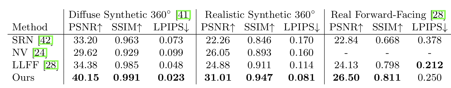 - 100장 → 25장으로 감소 시에도 NV, SRN, LLFF보다 높은 성능 유지