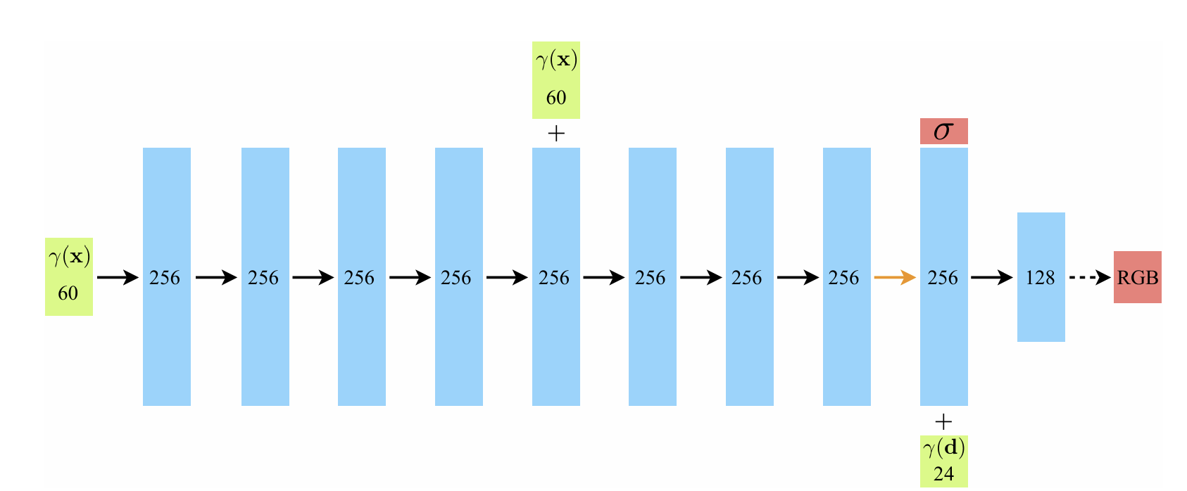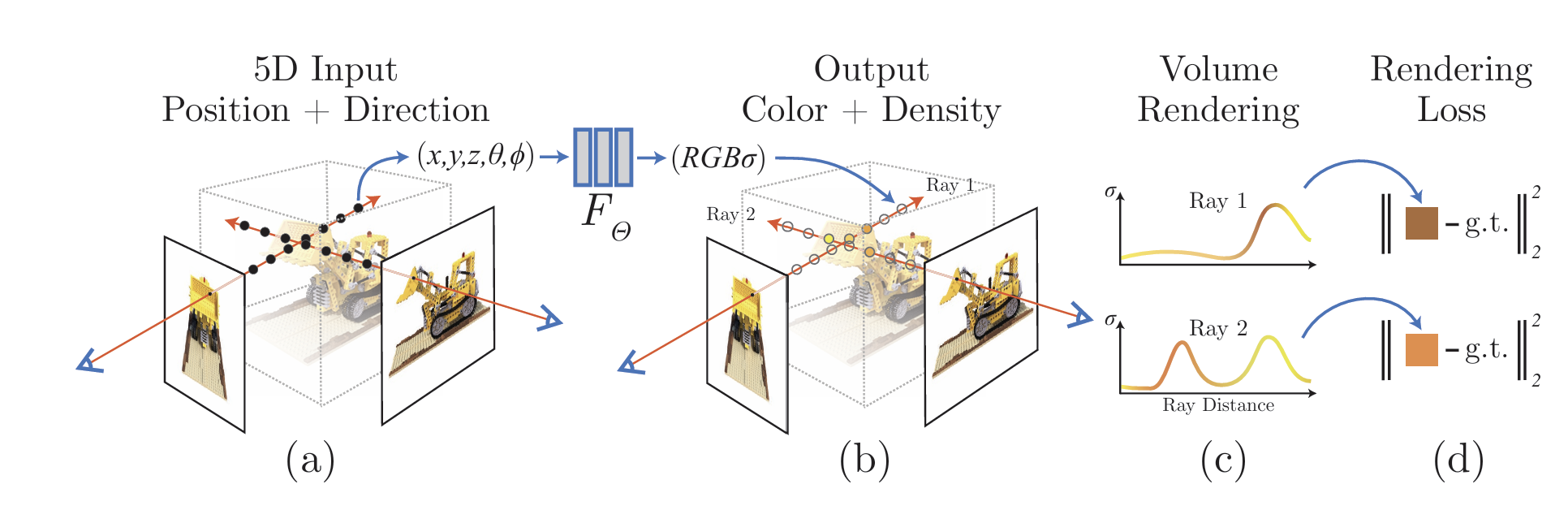 - Static scene을 5D continuous function $ F_\theta(x,y,z, \theta, \phi) = \sigma, c(r,g,b) $ 으로 표현