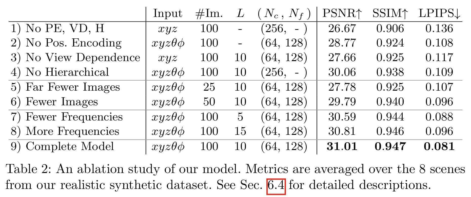 - 위치 인코딩 및 시점 의존성이 가장 큰 성능 향상을 제공
