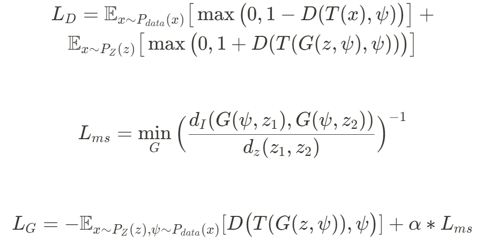 - $L_D$는 discriminator loss, $L_G$는 generator loss, $L_{ms}$는 mode-seeking regularizer term(정규화 항)