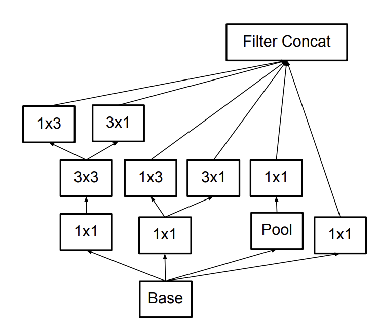 - VGG Net에서 나아가 1 x 3, 3 x 1 두 번으로 3 x 3의 receptive field를 얻기 : Parameter 수가 감소
