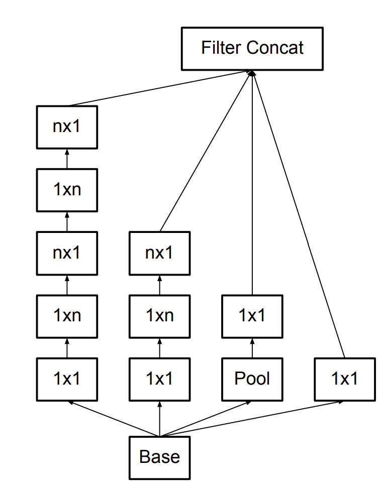 - 3 x 3 을 1 x 3 + 3 x 1 로 쪼개는 것도 반영 → 논문에서는 7 x 7 → 1 x 7 + 7 x 1을 제안