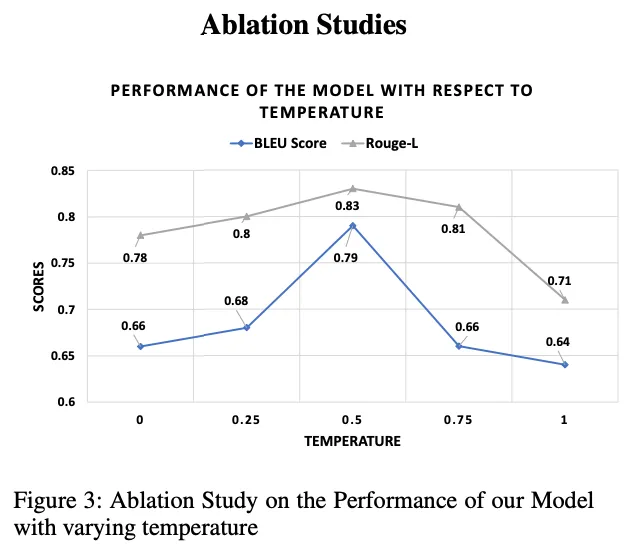 아래는 생성 모델에 영향을 미치는 두 가지 중요한 요소인 Temperature와 Beam Size의 영향을 탐구한 결과, 온도가 높아지다가 최적점(0.5)일때까지 점수가 증가하다가 이후에 감소하는 것을 볼 수 있었다. Beam Size의 경우는 Size가 커질수록 결과가 약간 개선되는 것을 보여주지만 추론 시간이 거의 기하급수적으로 증가하는 것을 볼 수 있어, 빔 값이 커질수록 성능은 좋아지지만, 높은 추론 시간으로 인해 개발자가 실시간으로 사용하기에 불편함을 초래할 수 있다는 것을 확인할 수 있었다.