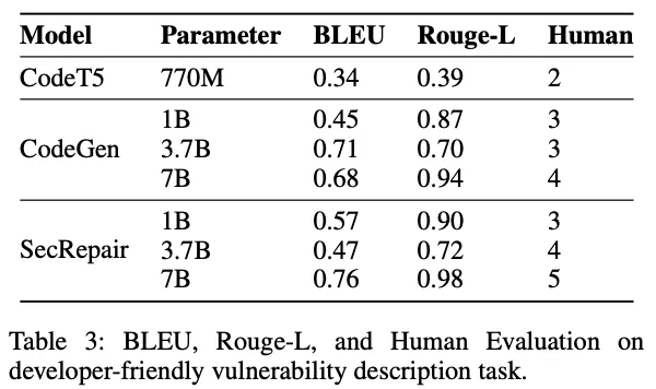 - 취약점 수정, 설명 생성, 코드 주석을 위해 생성 모델을 사용하여, 이에 적합한 BLEU, Rouge-L, 인간 평가 점수를 지표로 사용