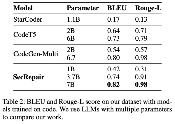 실험 결과는 비슷하거나 더 적은 매개변수를 가진 다른 모델들에 비해 SecRepair 모델의 우수성을 보여준다.