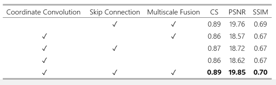 CoordConv, Skip Connection, Multiscale Fusion module 여부에 따라 성능 평가