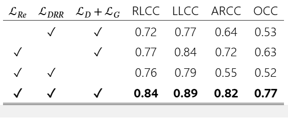 - 정성적 평가 : GAN loss 제거 시 폐 실질 흐릿, Reconstruction loss나 multi-angle projection loss 제거 시 폐 실질 부분이 개선되나 공기축적 영역과 폐 사이 경계 불분명, 3가지 loss 모두 학습 시 좋은 결과 - 폐실질 명확, 경계 정의