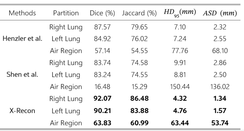 - Shen et al., Henzelr et al. : single view X-ray 이미지에 맞게 설계, 다른 viewpoint에 대한 흔적 흐릿, Shen은 심장 흉벽과 같은 대형 장기는 폐의 세부 정보를 잃어버림. Henzler는 폐 실질을 잘 구현하나 공기 축적 영역 재구성에 어려움