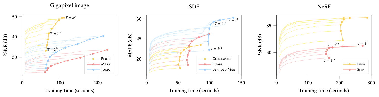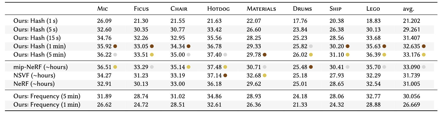 * Instant NGP: *비슷한 파라미터 수(T = 2²⁴)로 단 2.5분 만에 같은 PSNR(38.59 dB)에 도달, 4분 학습 후에는 최고 41.9 dB 도달