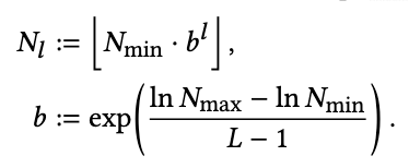 2. 레벨 l에 대하여, 입력 좌표 x∈R^d가 해당 레벨의 해상도 N_l 따라 스케일 조정 → 정수 좌표 두 개 계산하여 하나의 voxel 정의 (⌊x_l⌋:=⌊x⋅N_l⌋,⌈x_l⌉:=⌈x⋅N_l⌉)
