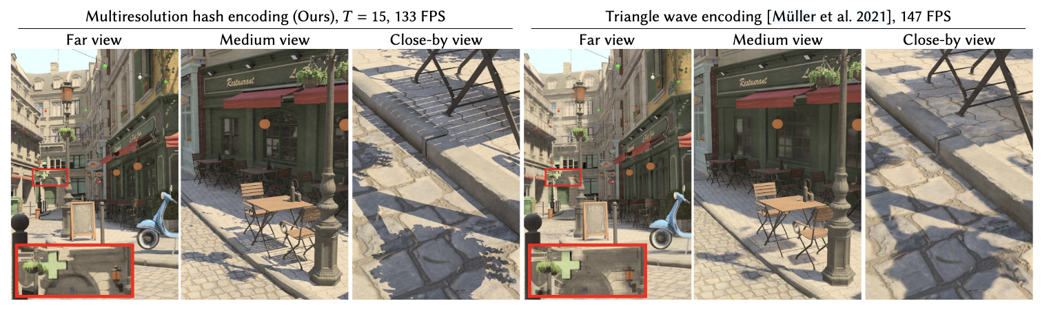 * 삼각파(triangle wave) 인코딩과 비교했을 때, Instant NGP가 더 선명한(sharper) 재구성 결과를 보여줌