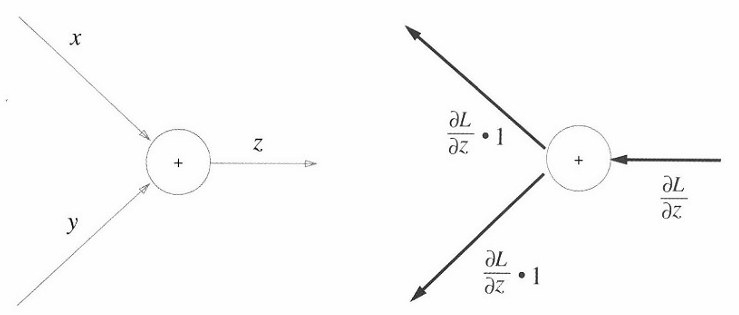 z = x + y 라는 식을 대상으로 역전파를 했을 때, x, y 각각에 대한 미분값은 1이 된다. 이를 계산 그래프로 나타냈을 때는 다음과 같다.