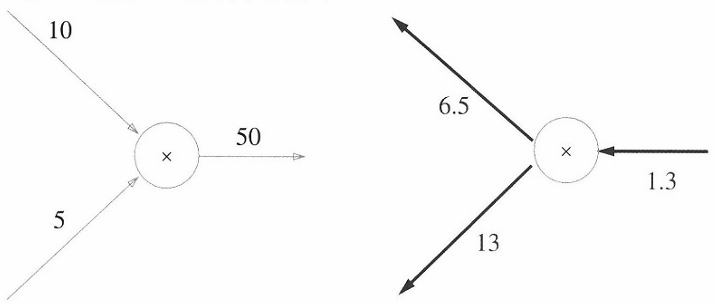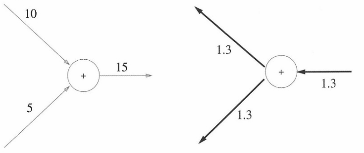 가령 '10 + 5 = 15'라는 계산이 있고, 상류에서 1.3이라는 값이 흘러나올 때, 계산 그래프는 다음과 같다.