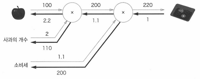 사과 가격의 미분은 2.2, 사과 개수의 미분은 110, 소비세의 미분은 200이다. 따라서 소비세와 사과 가격이 같은 양만큼 오르면 최종 금액에는 소비세는 200의 크기로, 사과 가격은 2.2의 크기로 영향을 준다고 해석할 수 있다.