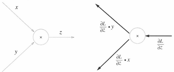 z = xy 라는 식을 대상으로 역전파를 했을 때, x, y 각각에 대한 미분값은 y, x가 된다. 이를 계산 그래프로 나타냈을 때는 다음과 같다.