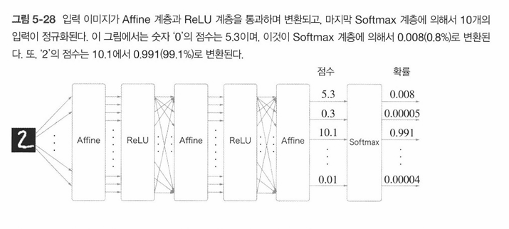 예를 들어 손글씨 숫자 인식에서의 Softmax 계층의 출력은 아래 그림 5-28처럼 된다.