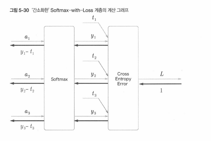 그림 5-30에서 주목할 것은 역전파의 결과이다. Softmax 계층의 역전파는 (y1 - t1, y2-t3, y3 - t3)라는 말끔한 결과를 내놓고있다.