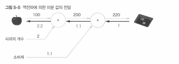 -[그림 5-1]과 같이 처음에 사과의 100원이 'x2' 노드로 흐르고, 200원이 되어 다음 노드로 전달된다.