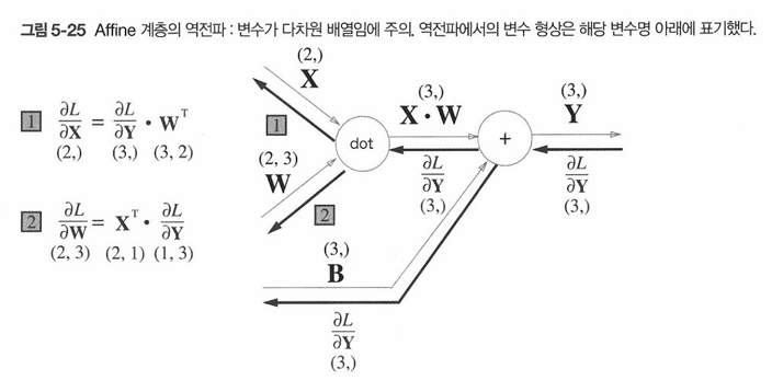 이제 위 5-24그림의 역전파에 대해 생각해본다면 행렬을 사용한 역전파도 행렬의 원소마다 전개해보면 스칼라값을 사용한 지금까지의 계산 그래프와 같은 순서로 생각할 수 있고 전개하면 다음 식이 도출된다.
