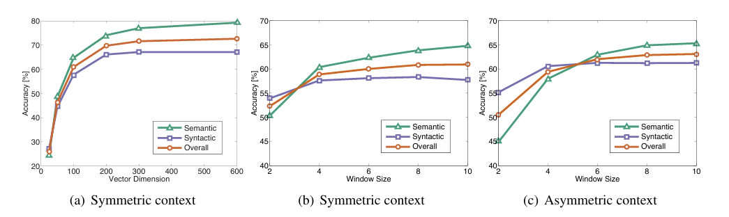 - (a)에서는 벡터 차원이 약 200이상일 경우 성능 향상이 둔화(diminishing returns)되는 경향/(b), (c)에서는 대칭 및 비대칭 윈도우 각각에 대해 윈도우 크기 변화의 영향 확인
