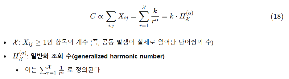 - 정확한 추정을 위해 단어 간 공동 발생 수가 단어쌍의 등장 빈도 순위 r에 따라 거듭제곱 법칙(power-law)을 따른다고 가정