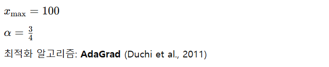 여기까지는 기존 Skip-Gram, ivLBL 방식이 암묵적으로 사용하는 가중치가 Xi라는 점을 확인한 것로, 이 가중치가 최적이 아닐 수 있기 때문에 빈도 높은 단어에 대해 효과적으로 가중치를 줄여 성능을 향상시키기 위해서 문맥 단어에 따라 달라질 수 있는 일반화된 가중치 함수 f(Xij)도입