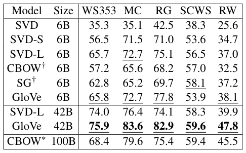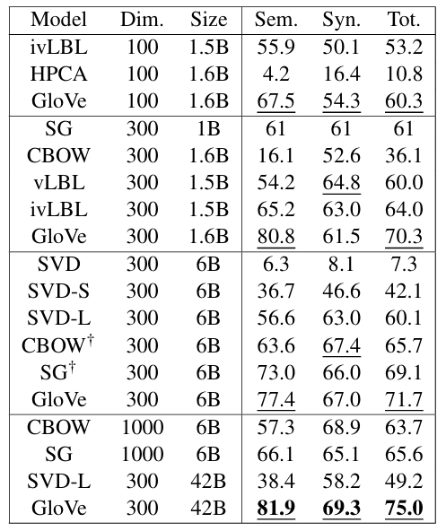 - GloVe는 더 작은 코퍼스를 사용했음에도 불구하고 CBOW (100B words)보다도 우수한 성능
