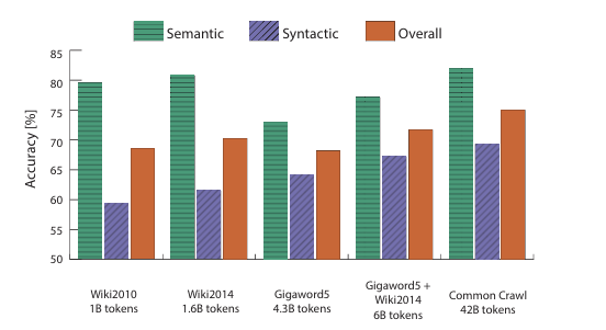 - 의미 유추 작업에서는 같은 경향이 관찰 X: 작은 Wikipedia 코퍼스에서 학습한 모델이 더 큰 Gigaword 코퍼스에서 학습한 모델보다 성능이 더 좋았음