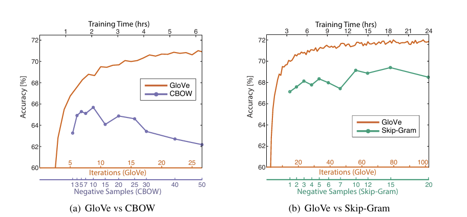 - GloVe와 word2vec 간의 정량적 비교는 여러 하이퍼파라미터가 성능에 영향을 미치기 때문에 하므로 벡터 크기, 윈도우 크기, 코퍼스, 어휘 수를 동일하게 설정하여 주요 변수들 통제