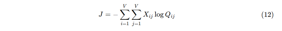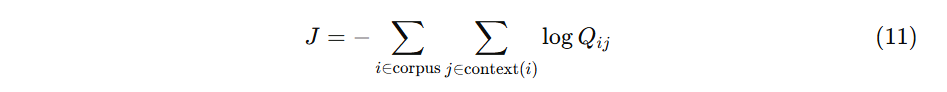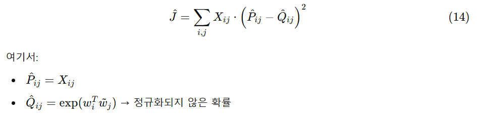 : 소프트맥스의 분모(정규화 항)는 계산 비용이 크기 때문에 Skip-Gram과 ivLBL 모델은 Q의 근사치를 사용하여 효율을 높이지만 i,ji, j가 같은 항목끼리 묶어 계산하면 더 효율적으로 전체 손실 함수를 계산할 수 있음