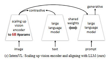 - 기존 VLLM은 비전 모델과 LLM을 연결하기 위해 QFormer 또는 선형 투영과 같은 경량 "glue" 레이어를 사용하지만, 이는 파라미터 규모 불일치, 표현 불일치, 비효율적인 연결 등의 문제점에 부딪혔다 . InternVL은 성능을 떠나 인코더를 LLM의 파라미터 규모에 맞춰 확장하고, 표현을 조화시키는 데 중점을 두어 해결하고자 하였다는 점에서 의미가 있는 모델이다.