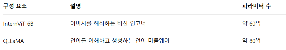 - 대규모 비전-언어 모델: 60억 개의 파라미터를 가진 비전 인코더와 80억 개의 파라미터를 가진 언어 미들웨어를 결합하여 모델 규모를 확장