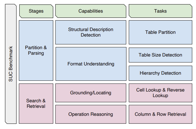 - 셀/열 검색: 구조적 정보를 검색하는 능력, 특정 위치에서 셀 값을 정확하게 검색해야 한다. 이 작업은 정보 파티셔닝과 파싱 능력에 의존한다.