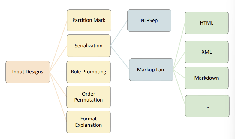 - 즉, 테이블 작업에 대한 LLMs의 상식적이거나 철저한 입력 디자인이 무엇인지에 대한 확고한 합의나 포괄적인 조사가 부족하다. 이전 연구들은 다양한 입력 디자인을 적응적인 방식으로 사용했다.