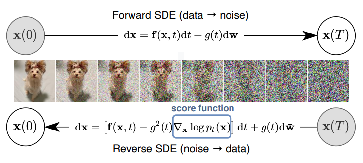 $$ d\mathbf{x} = [\mathbf{f}(\mathbf{x},t)\,-\,g(t)^2 \nabla_\mathbf{x}\mathrm{log}p_t(\mathbf{x})]dt\,+\,g(t)d\bar{\mathbf{w}} $$