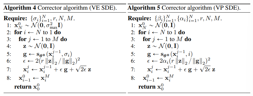 VE SDE, VP SDE에서 Predictor, Corrector는 각각 아래와 같이 나타난다.