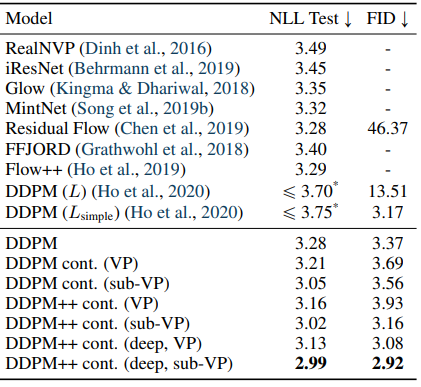 본 논문의 모델 중 가장 샘플링 품질이 좋은(FID가 낮은) 모델은 NCSN++ cont. (deep, VE)이다. 가장 likelihood가 좋은 (NLL이 낮은) 모델은 DDPM++ cont. (deep, sub-VP)이다.