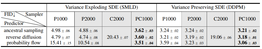 위 표에서 확인할 수 있듯이 predictor나 corrector만 사용한 샘플링 방식보다 이들을 동시에 사용한 방식이 더 좋은 품질의 이미지를 생성함을 확인할 수 있다.