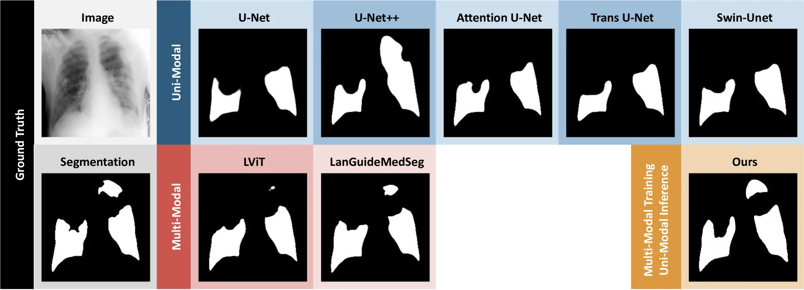 - 이미지와 텍스트를 함께 사용하는 멀티모달 학습이 단일 모달보다 더 뛰어난 성능을 보이며 CLIP과, LViT 같은 모델이 주목받음 → 추론 단계에서 텍스트를 필요로 하여 임상 적용에 제약이 됨