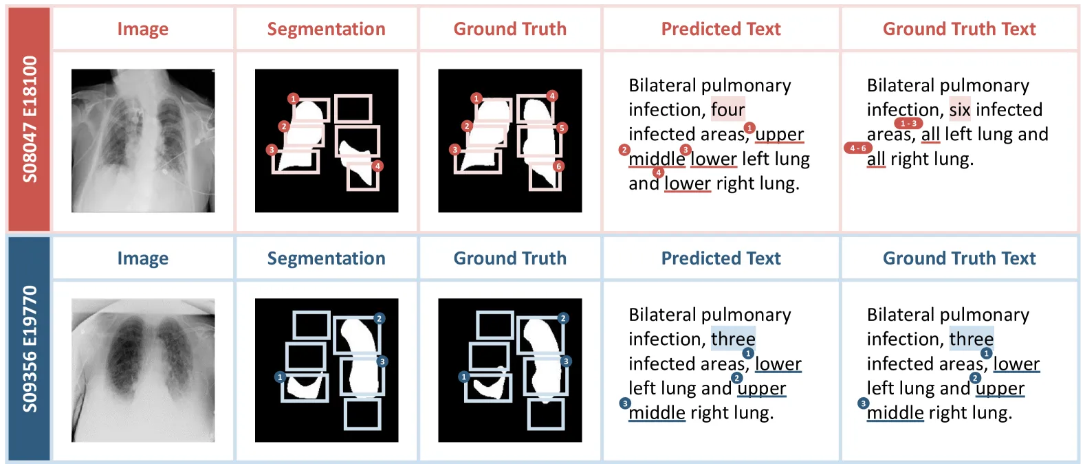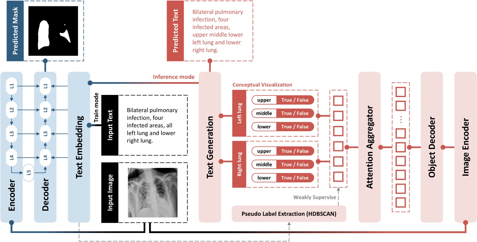 - 이 예측 결과를 감염 부위의 정확한 위치 정보로 디코딩하고 이를 텍스트 설명으로 변환해 분할 가이드로 사용한다.