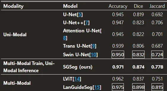 - 본 논문에서 제안하는 SGSeg는 기존 단일 모달(segmentation only) 모델보다 성능이 우수하며 최신 멀티모달 모델들과 거의 유사한 성능을 보인다.