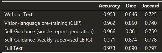 - 텍스트 없이도 추론 가능한 Self-Guided Segmentation(SGSeg) 프레임워크를 제안하여 기존 유니 모달 방법보다 뛰어난 성능을 보였고, 텍스트를 사용하는 멀티 모달 방법들과도 근접한 성능을 달성하였다.