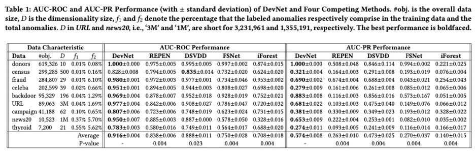 fraud detection, malicious URL detection, disease detection 등 서로 다른 도메인에서 의 총 9개의 데이터셋을 통해 실험이 진행되었다. 비교 대상은 앞서 언급되었던 REPEN, Deep SVDD, FSNet, iForest 등의 모델이다. 참고로 공정한 실험 진행을 위해 각 모델에 적절한 변형이 가해졌다. 평가 방식은 AUROC와 AUC-PR 방식을 사용했다. 결과는 다음과 같다. 또한 Wilcoxon Signed Rank Test를 이용해 아래 수치가 통계적으로 유의미함을 보였다.
