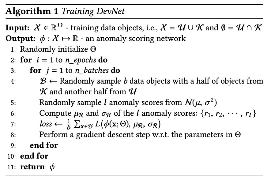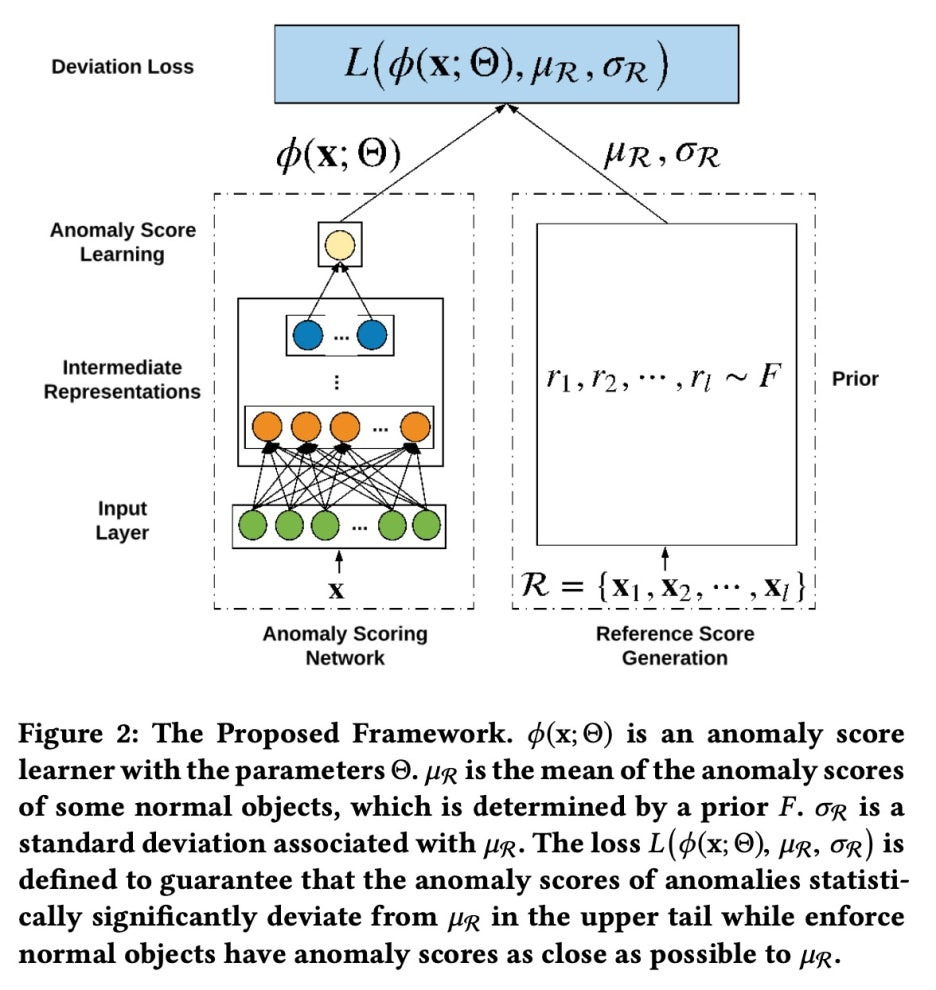 위 그림을 보면 DevNet모델은 크게 두 부분으로 구성됨을 볼 수 있다. 먼저 모든 데이터에 대해 Anomaly Score를 분석하는 부분과 Reference Score(참조 점수)를 계산하는 부분이다. 참조 점수는 정상 데이터 N 중 일부를 샘플링해 구한다. 이 후 이 두 점수를 손실 함수에 입력해 이상치를 판별한다. 자세한 내용은 이후에 나온다.