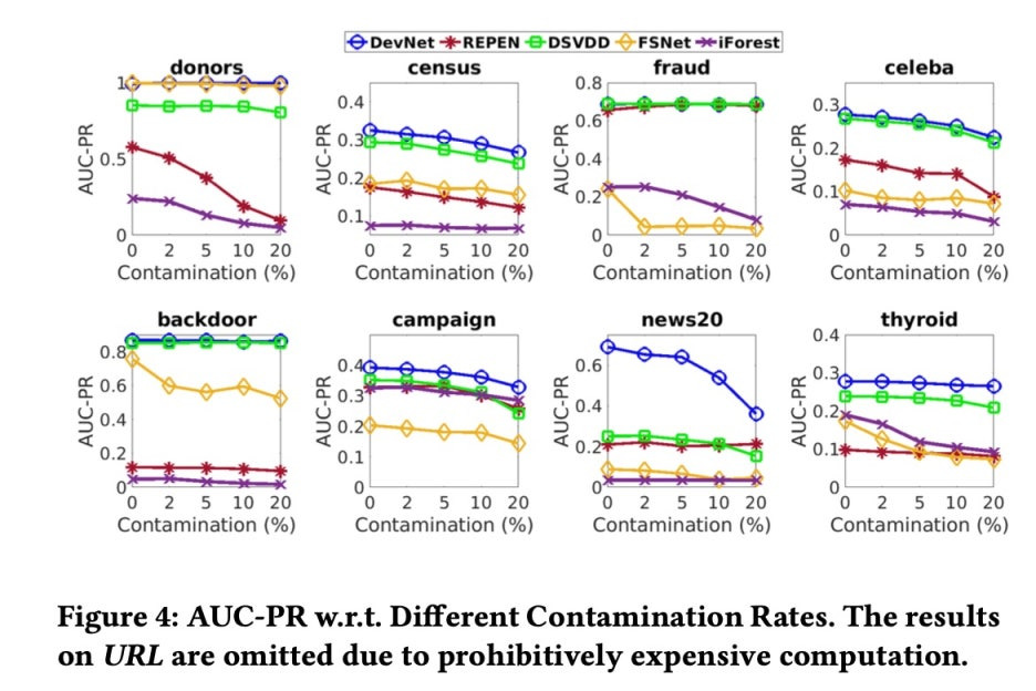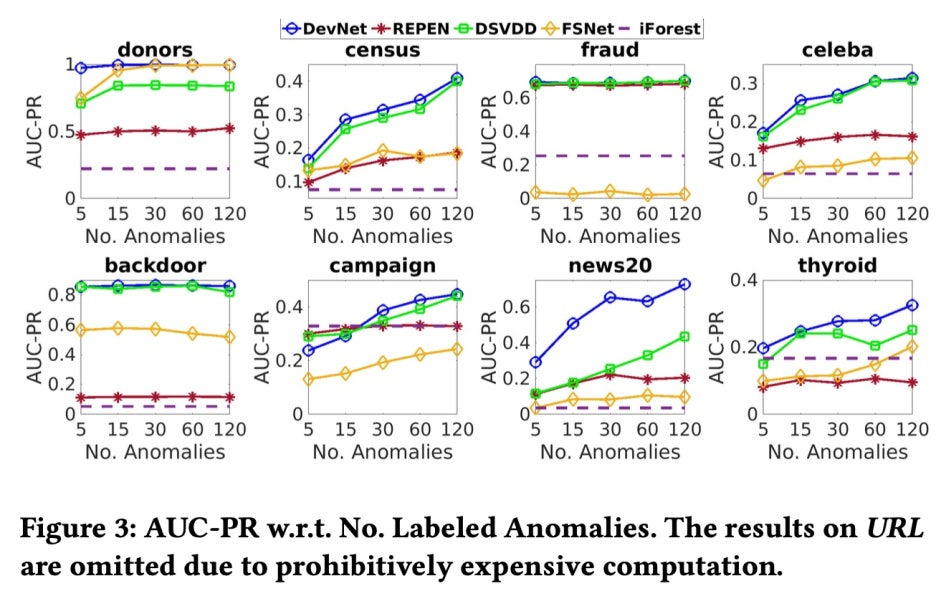 다음은 데이터 효율성에 관한 실험이다. 데이터 효율성이란 얼마나 적은 레이블 된 데이터셋에서도 좋은 성능을 발휘하는지에 대한 문제인데 여기서 레이블 된 데이터셋의 이상치 비율은 2%로 고정시켜놓고 실험을 진행했다. 실험결과 역시 DevNet이 가장 놓은 성능을 발휘했다.