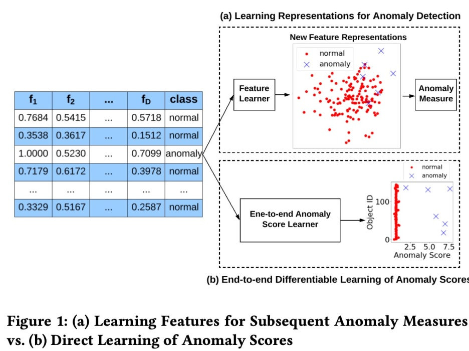 - 딥러닝 기반 이상치 탐지 방식으로 Autoencoder, GAN기반의 학습은 물론 REPEN, Deep SVDD 등의 방식 또한 제안되었다. REPEN과 Deep SVDD의 경우에는 표현학습을 개선하는데에서 큰 성과가 있었지만 여전히 이상 점수의 최적화가 특징 학습에 의존하고 있다는 한계가 있었다. 논문에서는 이를 간접적인 방식이라고 지적하고 있다.